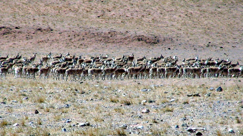 這是羌塘國家級自然保護(hù)區(qū)正在遷徙中的國家一級保護(hù)動物藏羚羊中的雌性藏羚羊(唐召明2006年攝)