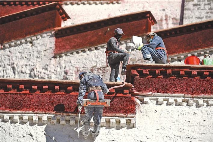 世界文化遺產(chǎn)布達拉宮10月26日起迎來了一年一度的粉刷季,工作人員將用10余天的時間對宮墻、白塔、窗框進行整體粉刷,為布達拉宮美顏。圖為10月28日,施工人員給布達拉宮墻體噴灑涂料。記者 李洲 洛桑 攝