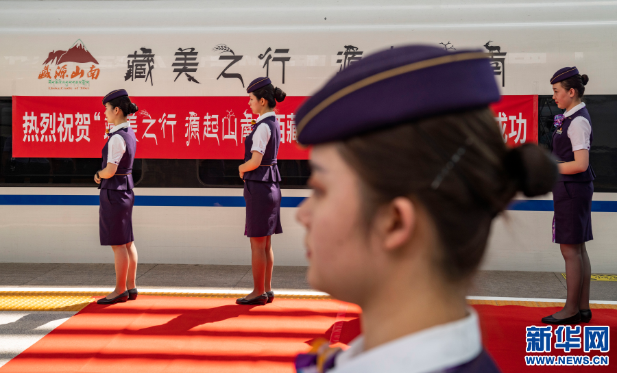 8月25日,“藏美之行 源起山南”高鐵冠名列車首發(fā)儀式在上海虹橋站舉行,首列西藏旅游主題高鐵冠名列車在滬首發(fā)。新華社記者 普布扎西 攝