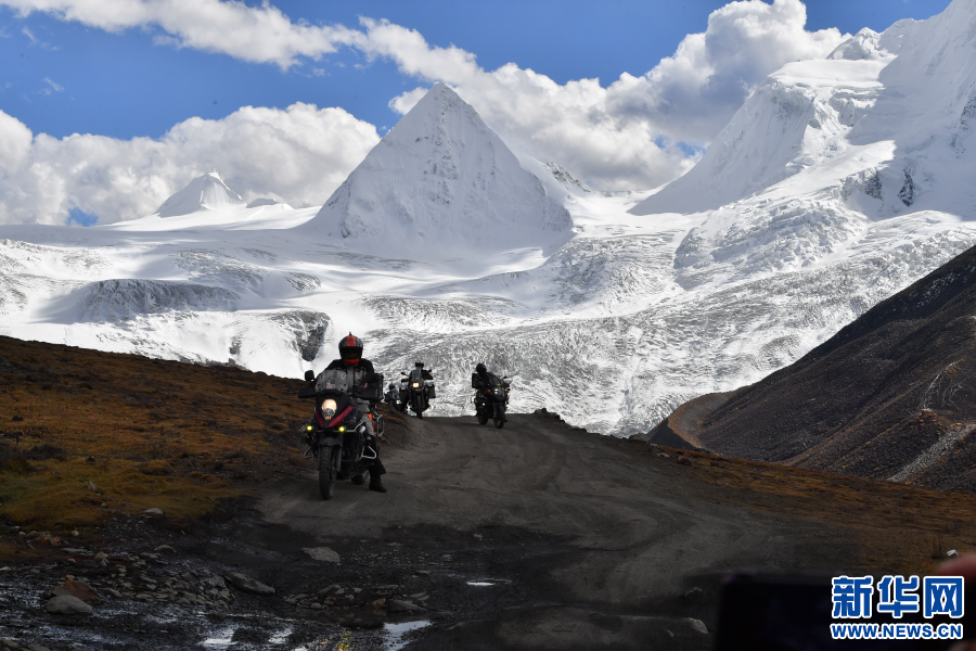 幾名摩托車自駕行的內(nèi)地游客在西藏那曲薩普雪山前騎行(10月11日攝)。新華社記者 晉美多吉 攝