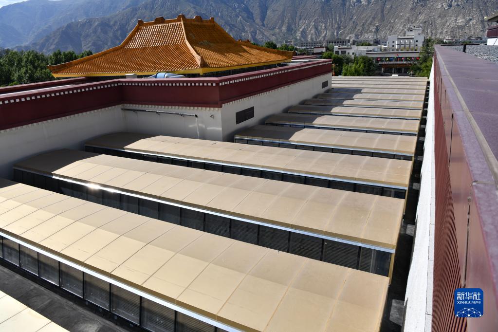 中建一局工作人員檢查高散輻射主動(dòng)式太陽(yáng)能供暖設(shè)備(7月6日攝)。新華社記者 晉美多吉 攝