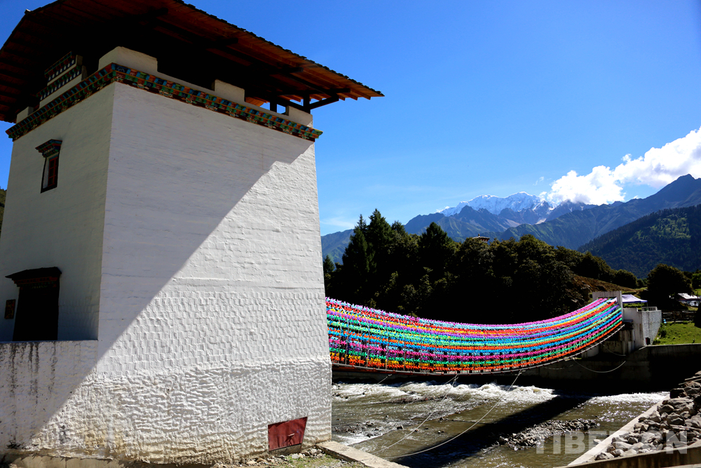 圖為魯朗小鎮(zhèn)景區(qū)旁的“網(wǎng)紅橋”上掛滿了顏色各異的風(fēng)車 攝影:王佳豪