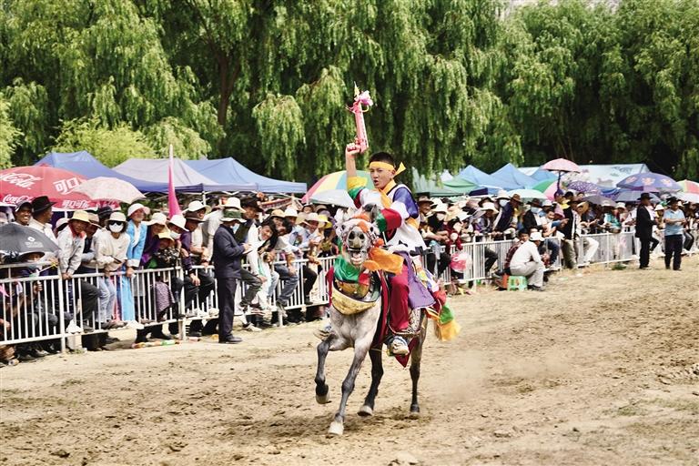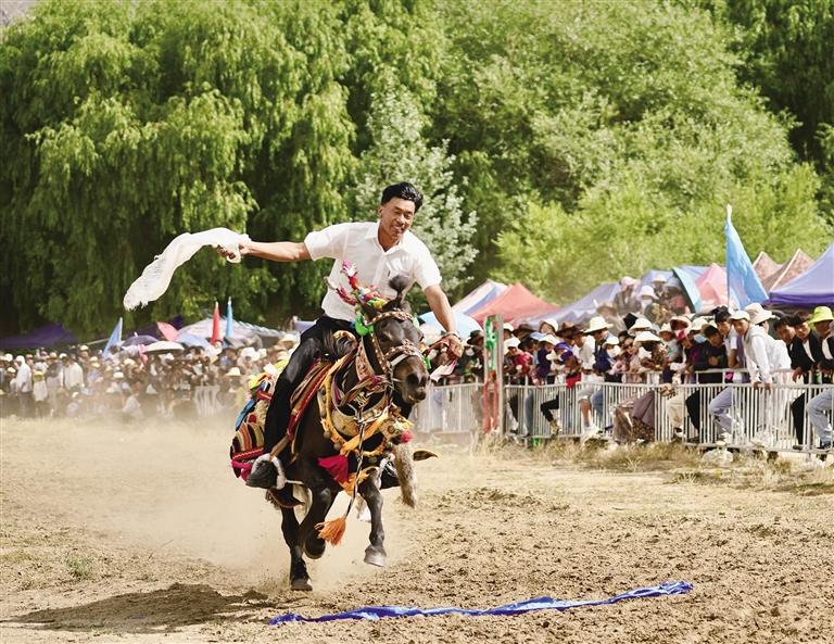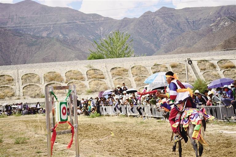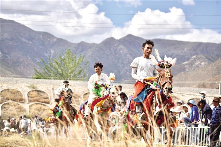 當(dāng)日上午11時(shí),茶巴朗村望果節(jié)賽馬正式開(kāi)始,騎手們身著傳統(tǒng)服飾,戴著紅纓帽,身背彎弓,騎著打扮華麗的駿馬,進(jìn)行了4000米速度賽馬、拾哈達(dá)、射箭、馬術(shù)等精彩比賽?,F(xiàn)場(chǎng),觀眾揮舞手臂為選手們鼓勁吶喊。馳騁在賽場(chǎng)上,選手的吆喝聲伴著觀眾的吶喊聲在賽場(chǎng)上空匯聚。