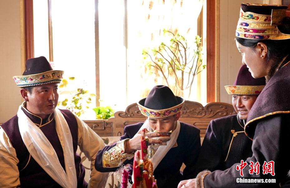 11月24日恰逢藏歷十月初一,西藏林芝迎來2023年工布新年,這是西藏最早的新年。工布新年以其悠久的歷史、鮮明的特色、豐富的內(nèi)涵,于2006年被列入第一批西藏自治區(qū)非物質文化遺產(chǎn)保護名錄。圖為村民向客人敬酒。 阿仁 攝