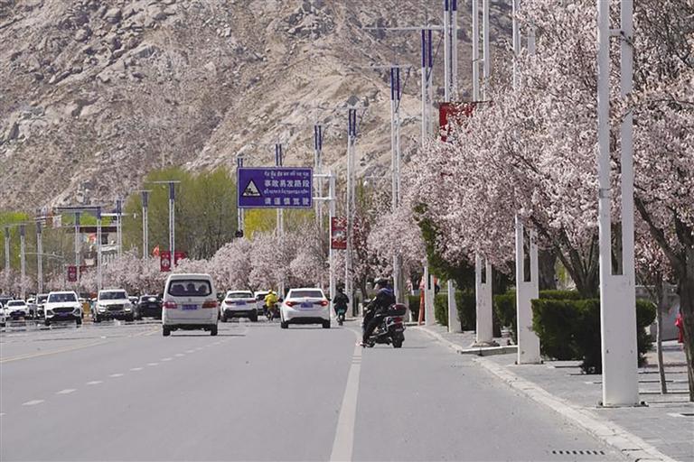 那么,去哪里查收這份“春日限定大禮包”呢?最近幾天,記者的朋友圈都被帕崩崗的美景霸屏了,一波又一波的朋友到這里打卡。除了去帕崩崗賞桃花,更不容錯過的一定是拉薩大街小巷以及公園中驚鴻一瞥的美景。宗角祿康公園植被繁茂、古樹較多,一到春季,玫粉色的榆葉梅綻放枝頭,層層花瓣在陽光的照耀下嬌俏動人,一樹粉色花朵倒映在幽綠的湖水中,盡顯詩意。此外,緊鄰羅布林卡的羅堆東路也有意想不到的美景,每到這個(gè)季節(jié),紅葉李便會沿路盛開,淡粉色的花瓣搭配深紅色的花蕊,甚是好看。金珠西路沿途的景色也令人耳目一新,淡粉色的花朵肆意綻放,等紅燈時(shí)的心情因這些花朵變得不再焦灼。