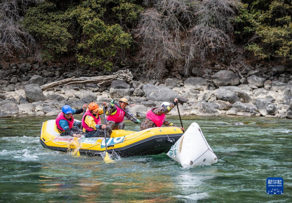 4月16日,在激流漂流筏繞標(biāo)賽中,“星野新域漂流隊(duì)”選手向終點(diǎn)沖擊。他們最終獲得第十名。新華社記者 孫非 攝