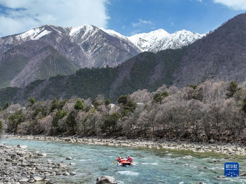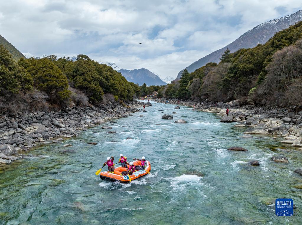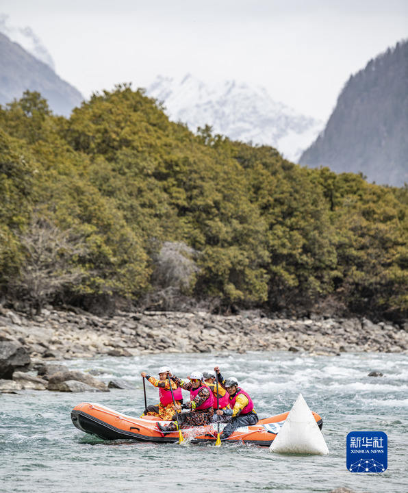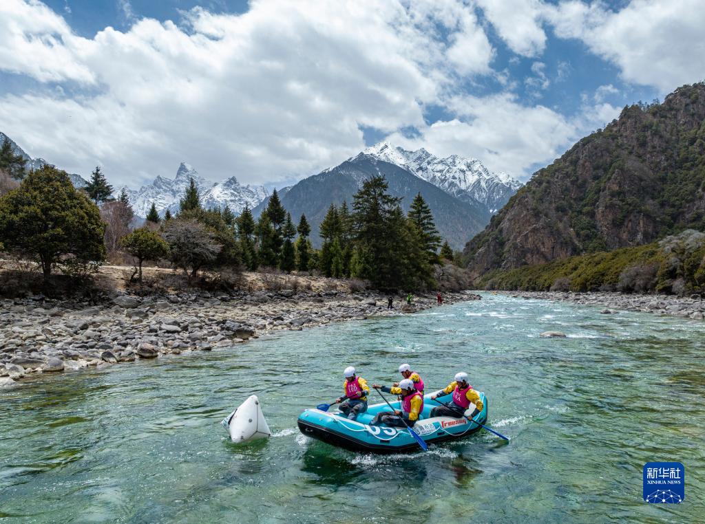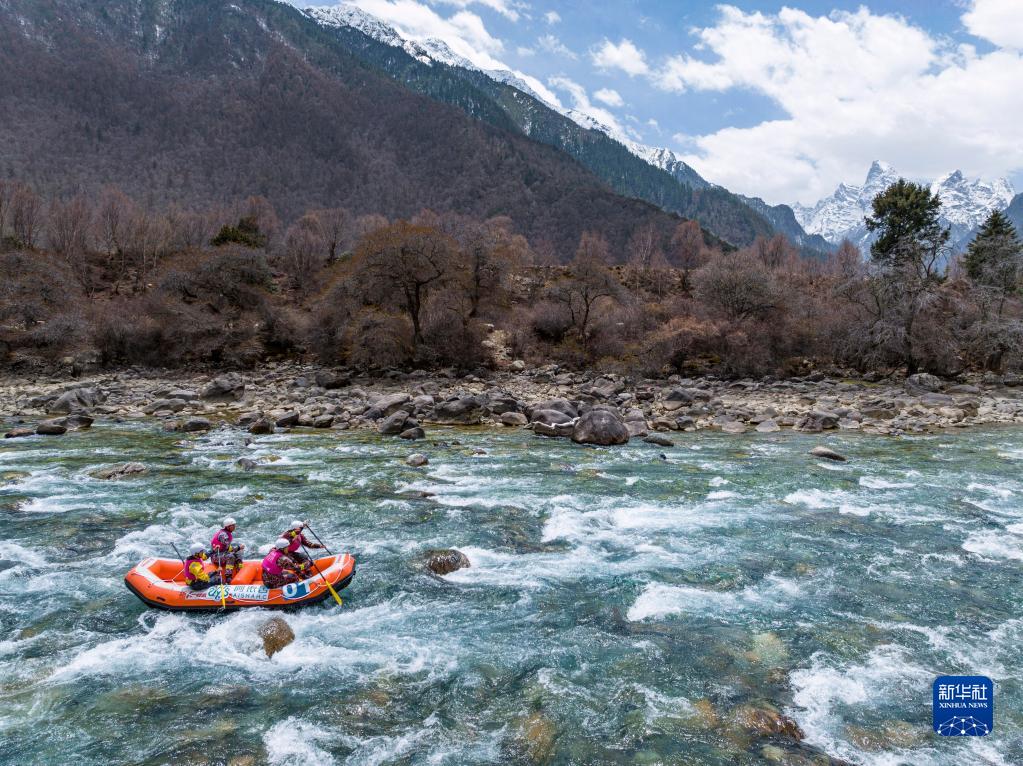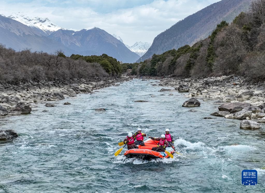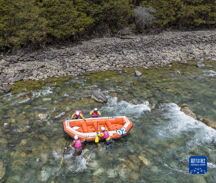 4月16日,“西藏旅游股份有限公司漂流隊(duì)”選手在激流漂流筏繞標(biāo)賽中,他們最終獲得季軍(無人機(jī)照片)。新華社記者 孫非 攝