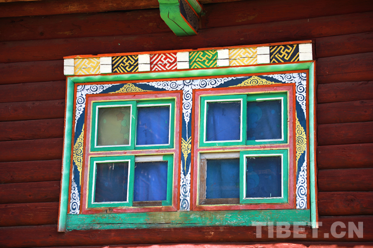 窗戶中的窗飾格、窗套和窗楣等,都是傳統(tǒng)藏式民居特色的體現(xiàn)。窗框?yàn)榉叫?,多為田字形窗扇,現(xiàn)在也有一些是漢式小方格和花格窗扇,裝飾著特色花紋。