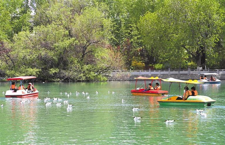 立夏時(shí)節(jié),拉薩處處綠樹成蔭、鳥語(yǔ)花香。宗角祿康公園樹木郁郁蔥蔥、湖水清澈見底,成為市民和游客游玩、休閑的好去處。 圖為市民和游客在宗角祿康公園乘船游玩。記者 洛桑 攝