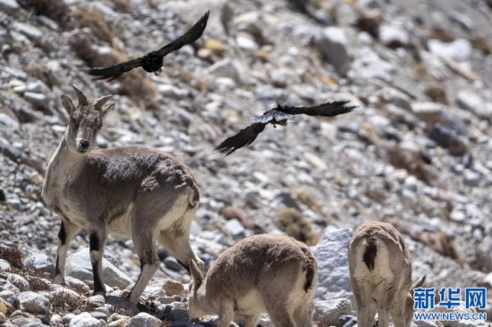 5月9日,在珠穆朗瑪峰登山大本營(yíng)附近拍攝的黃嘴山鴉與巖羊。新華網(wǎng) 旦增努布 攝