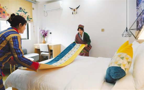 圖為林芝市墨脫縣背崩鄉(xiāng)巴登村村民在民宿中整理床鋪。記者 洛桑 攝