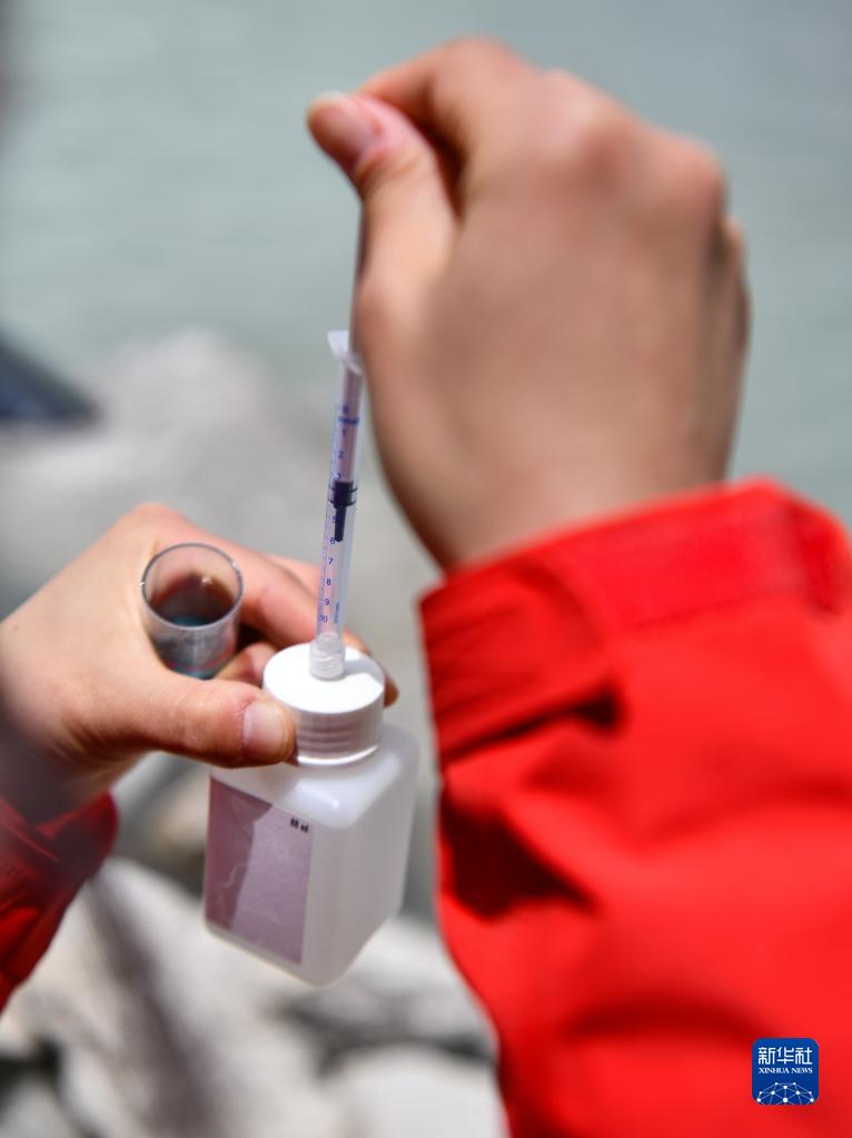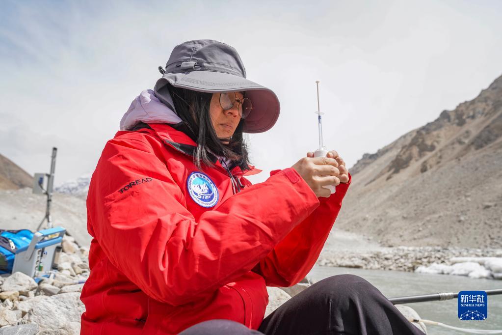 在珠峰登山大本營(yíng)附近,來自中國(guó)科學(xué)院青藏高原研究所的科考隊(duì)員邱海英在檢測(cè)絨布冰川末端水質(zhì)(5月14日攝)。新華社記者 孫非 攝