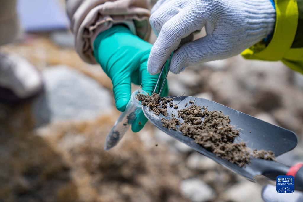 在珠峰登山大本營(yíng)附近,來自西藏大學(xué)生態(tài)環(huán)境學(xué)院的科考隊(duì)員在收集土壤樣本(5月22日攝)。新華社記者 孫非 攝