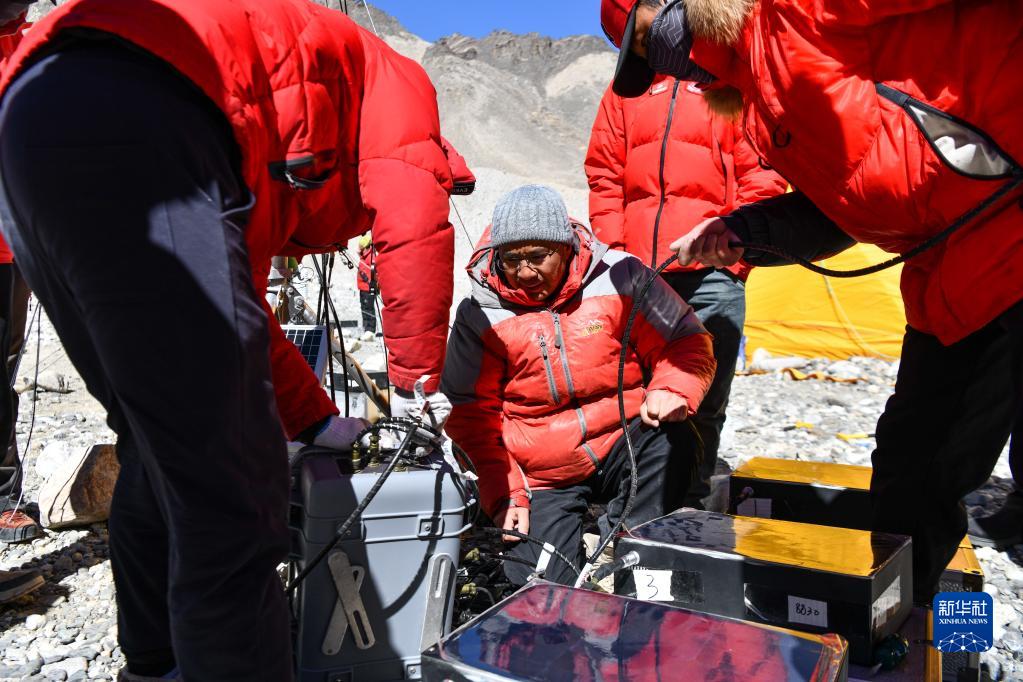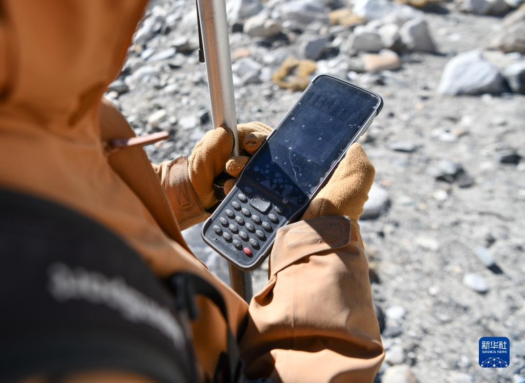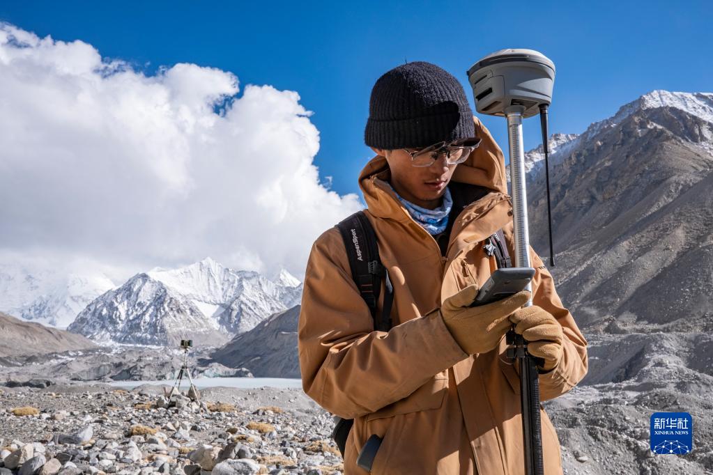 在珠峰海拔約5300米處,來自中國(guó)科學(xué)院西北生態(tài)環(huán)境資源研究院的科考隊(duì)員薛雨昂在對(duì)冰川進(jìn)行實(shí)時(shí)差分GPS定位(5月15日攝)。新華社記者 晉美多吉 攝