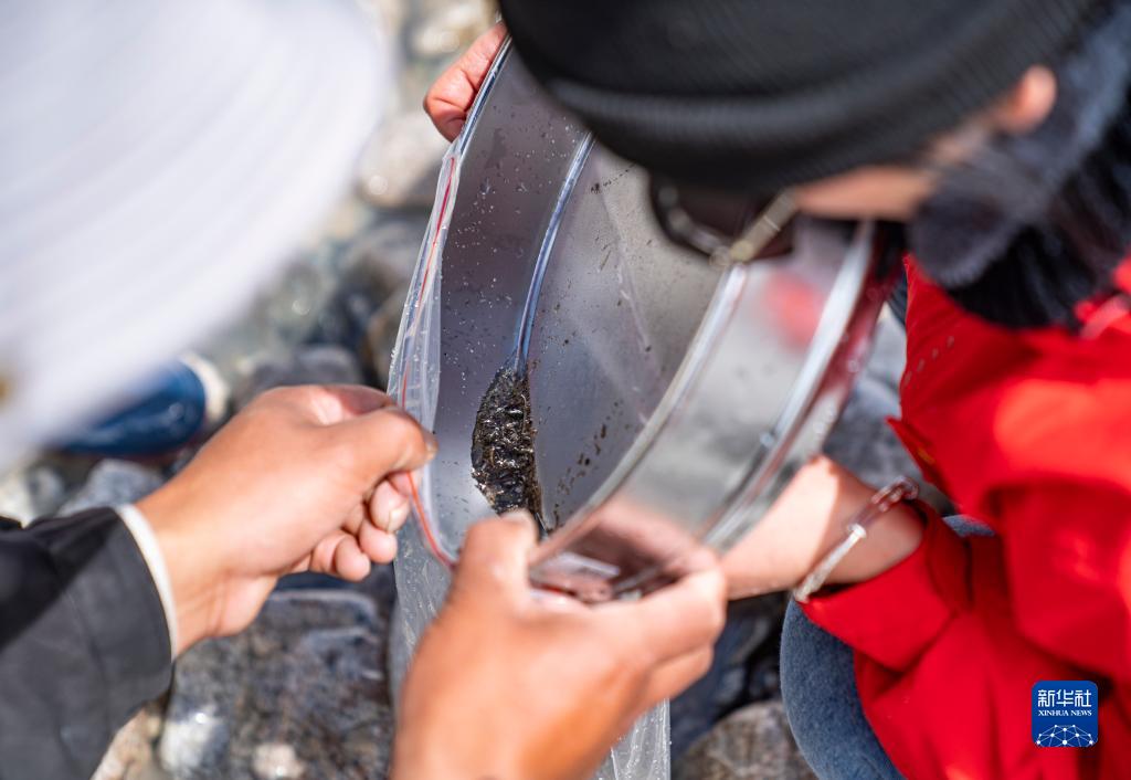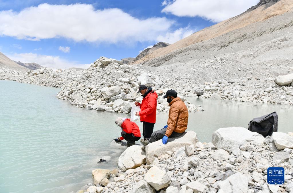 在珠峰登山大本營(yíng)附近,來自西藏大學(xué)生態(tài)環(huán)境學(xué)院的科考隊(duì)員在收集水生生物樣本(5月22日攝)。新華社記者 孫非 攝