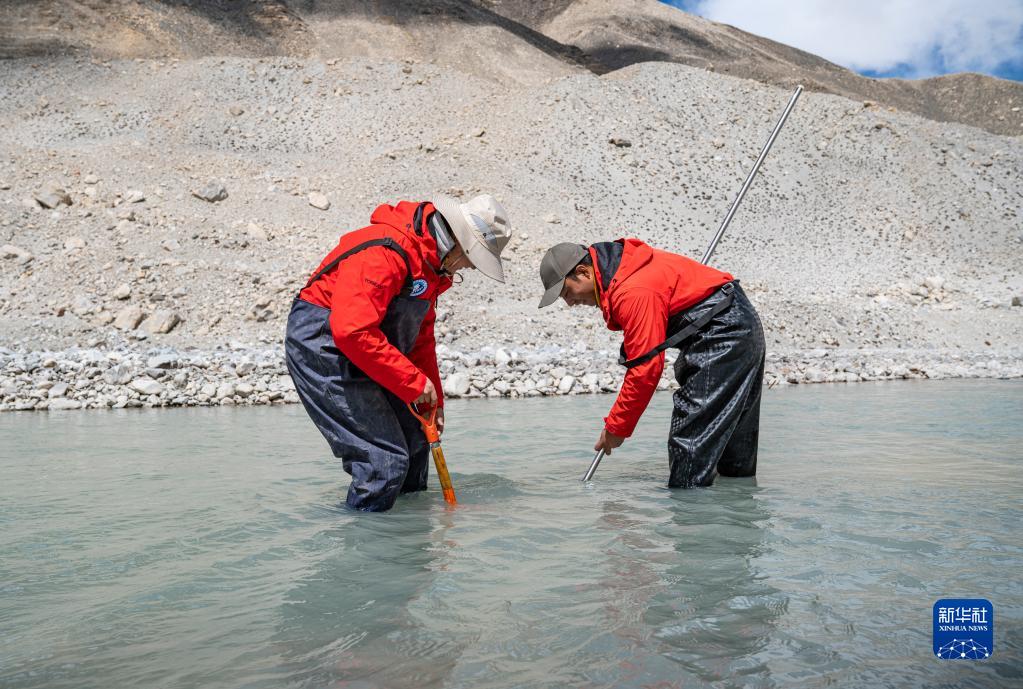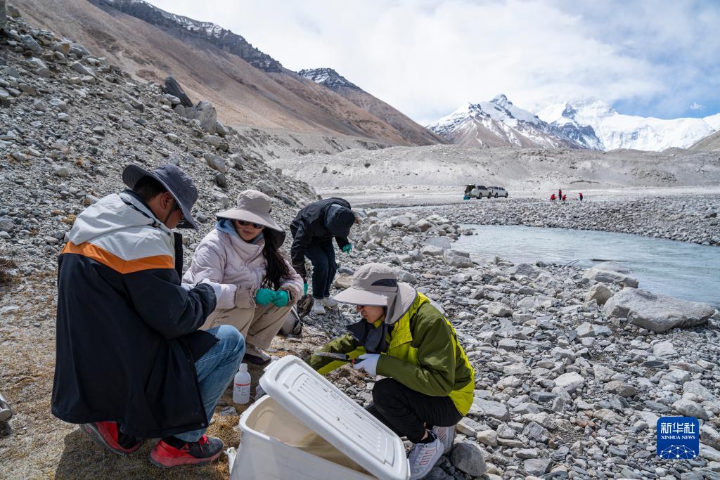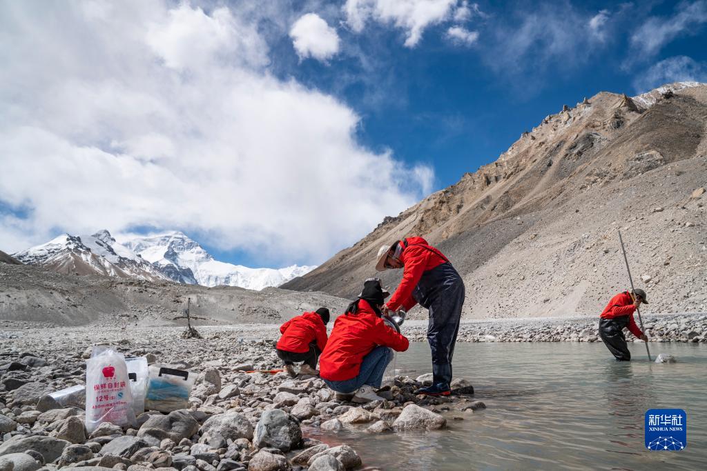 在珠峰登山大本營(yíng)附近,來自西藏大學(xué)生態(tài)環(huán)境學(xué)院的科考隊(duì)員在進(jìn)行水生態(tài)調(diào)查(5月22日攝)。新華社記者 孫非 攝