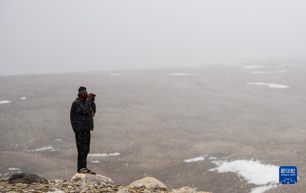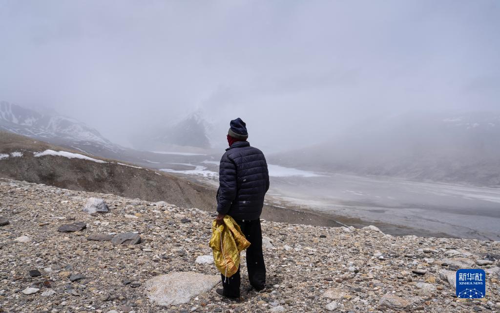 乃乃在用望遠(yuǎn)鏡查看冰川是否有異樣(5月31日攝)。新華社記者 晉美多吉 攝