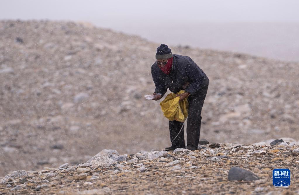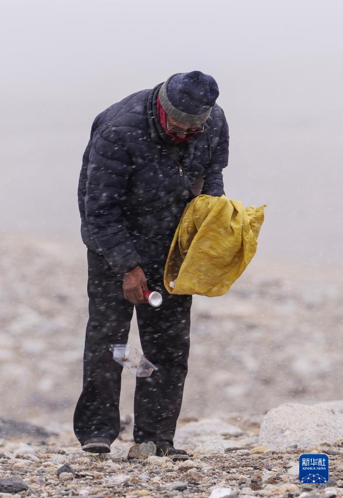 5月31日,乃乃老人在杰瑪央宗冰川附近撿拾垃圾。新華社記者 費(fèi)茂華 攝