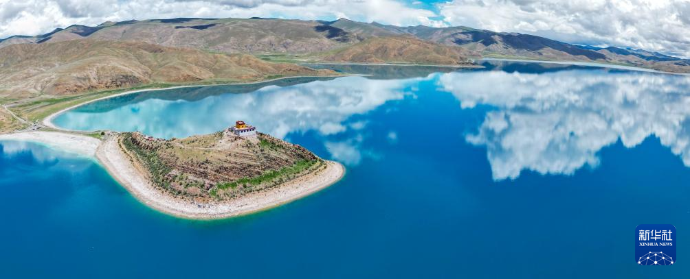 坐落于羊湖北岸一座半島上的日托寺(無人機(jī)拼接照片,7月22日攝)。新華社記者 聶毅 攝