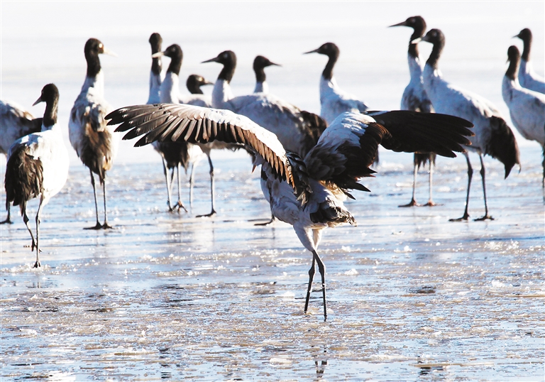 一群黑頸鶴在拉薩市林周縣濕地里嬉戲。本網記者 姚海全 攝