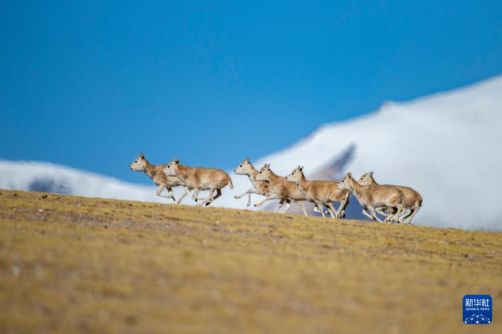 在羌塘國家級自然保護(hù)區(qū),一群雌性藏羚羊在奔跑(12月16日攝)。新華社記者 姜帆 攝