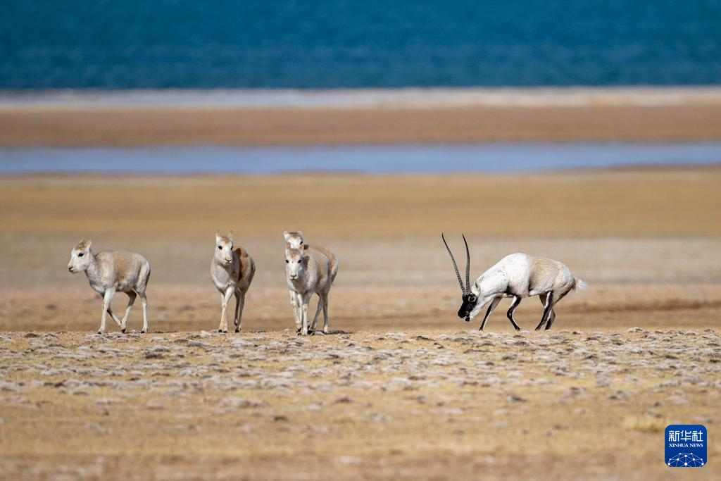 在羌塘國家級自然保護(hù)區(qū),一只贏得交配權(quán)的雄性藏羚羊守護(hù)著自己的“后宮”(12月16日攝)。新華社記者 姜帆 攝