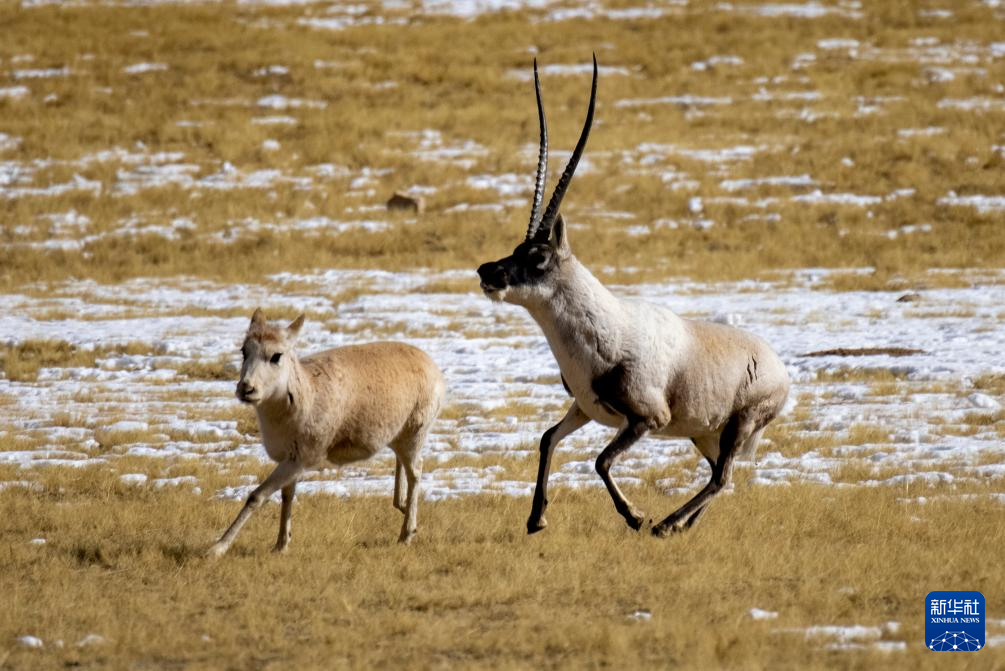 在羌塘國家級自然保護(hù)區(qū),一只雄性藏羚羊在奔向雌性(12月16日攝)。新華社記者 姜帆 攝