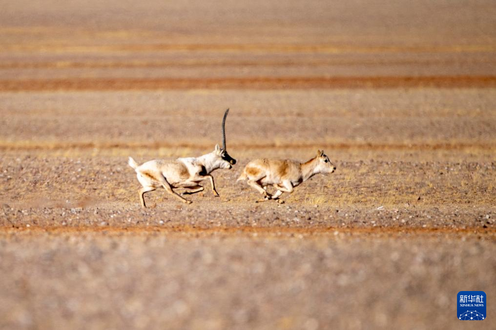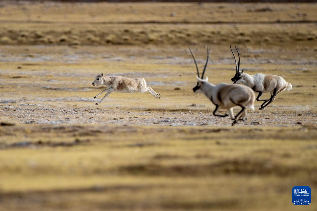 在羌塘國家級自然保護(hù)區(qū),兩只雄性藏羚羊為爭奪交配權(quán)而相互追逐(12月16日攝)。新華社發(fā)(旦增努布 攝)