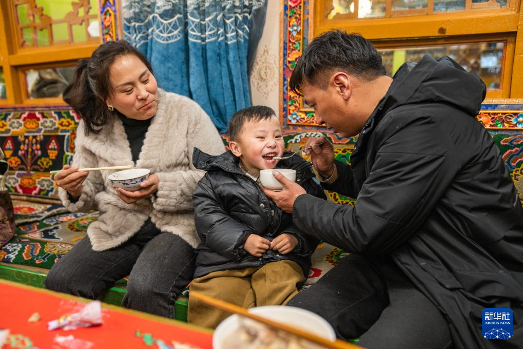 巴桑普尺一家人在吃“古突”(1月10日攝)。新華社發(fā)(丁增尼達 攝) ??