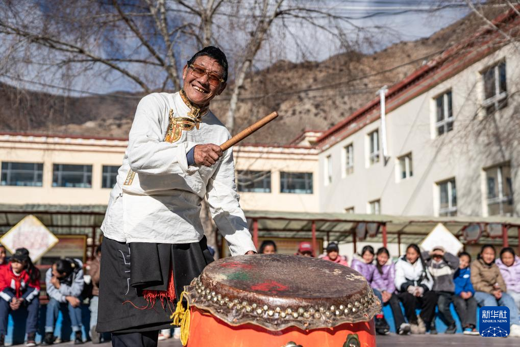 在西藏昌都市洛隆縣碩督鎮(zhèn)小學(xué),鄧巴阿尼在擊鼓伴奏(1月19日攝)。新華社記者 丁增尼達 攝
