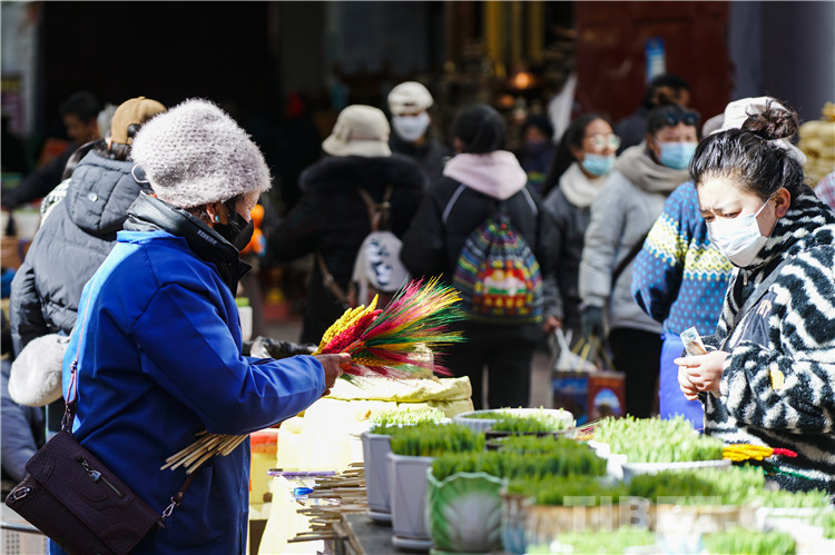 圖為正在銷售青稞苗和“洛薩美朵”的藏族阿佳 攝影:趙振宇