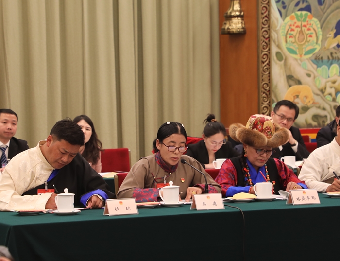 圖為其德在十四屆全國人大二次會(huì)議西藏代表團(tuán)開放團(tuán)組會(huì)議上發(fā)言攝影:桑吉