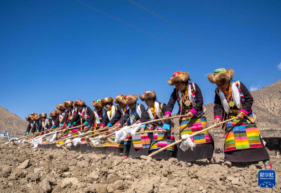 當日是西藏農(nóng)民舉行一年一度春耕大典的日子。村民沿襲著傳承千年的春耕民俗,身著節(jié)日盛裝,手捧“切瑪”(五谷豐登斗),唱起祈愿歌,互敬青稞酒。當鐵犁翻開土地,婦女將手中的種子撒下,祈求新的一年豐收?! ??
