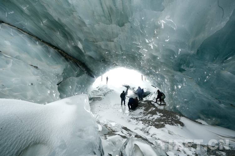 圖為工作人員在然普冰洞內(nèi)部進(jìn)行勘測(cè)。攝影:斯郎曲平
