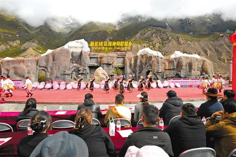 近日,尼屋鄉(xiāng)第三屆“鄉(xiāng)村振興 那曲奮進(jìn)”活動成果展暨那曲市嘉黎縣尼屋鄉(xiāng)第九屆桃花文藝匯演活動舉辦,來自全國各地的游客與當(dāng)?shù)厝罕娨黄鹩^看表演,現(xiàn)場氣氛熱烈。