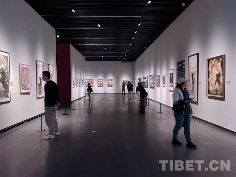 走進西藏美術館,館內A區(qū)1號展廳正在展出“雪域名家”系列的第一個展覽“雪域尋夢·余友心美術作品展”。