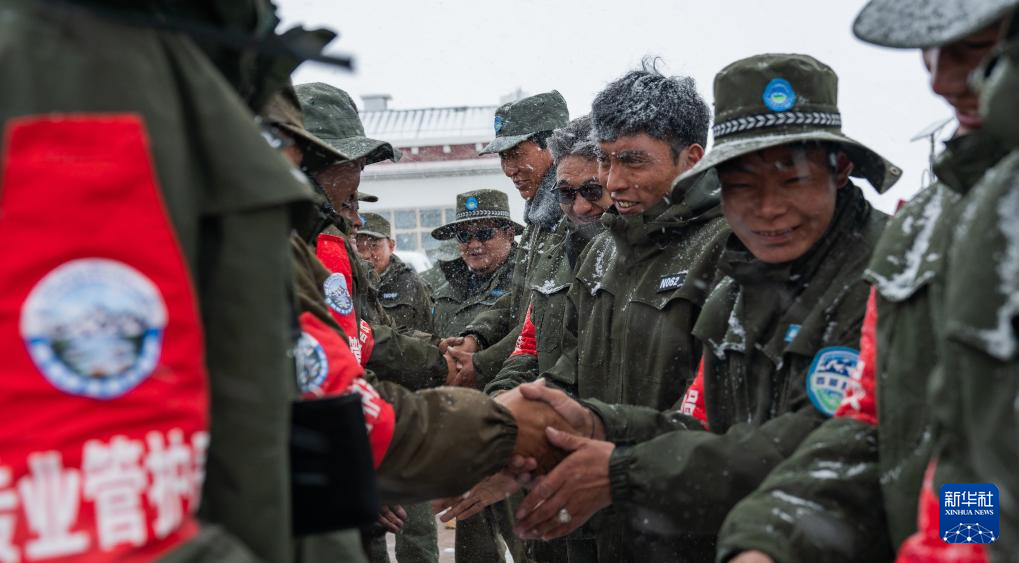 布查玉管護(hù)站的野生動物管護(hù)隊員們熱情歡迎風(fēng)雪中前來巡護(hù)的同事(5月7日攝)。新華社記者 丁增尼達(dá) 攝 ??