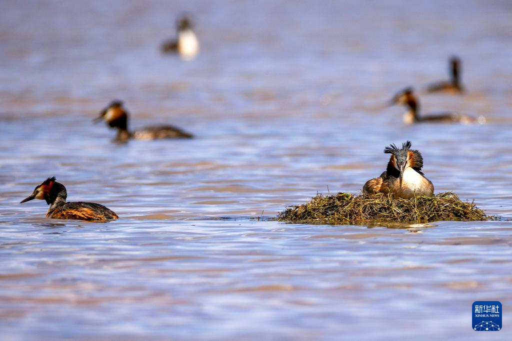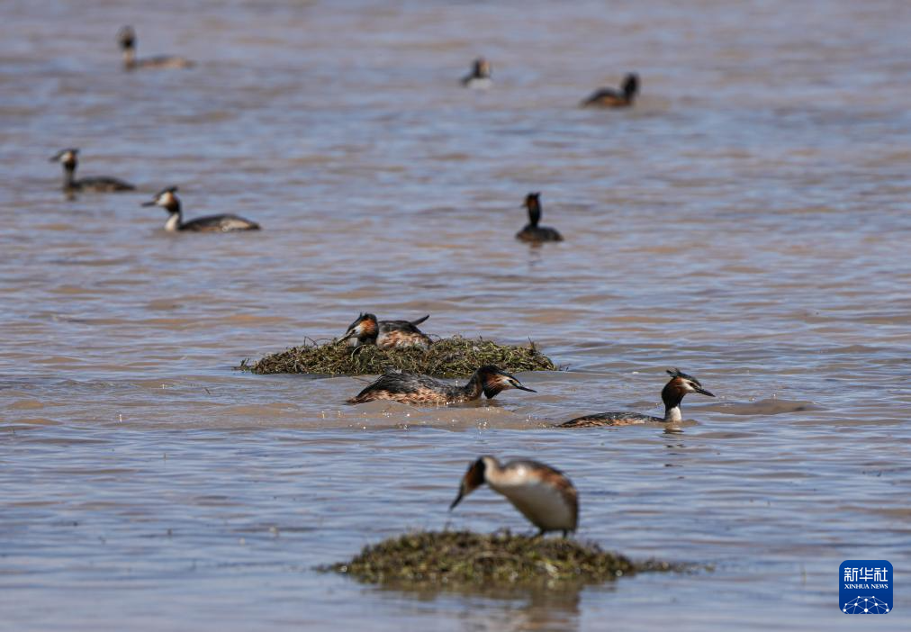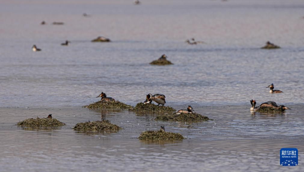 時值初夏,一群鳳頭鸊鷉在西藏自治區(qū)那曲市申扎縣下過鄉(xiāng)格仁錯旁邊的濕地營巢孵卵,準備迎接新生命的誕生。