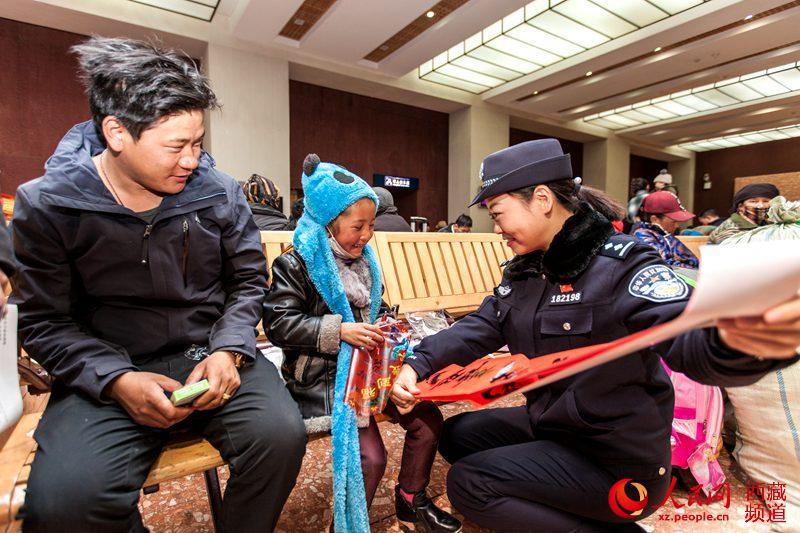 按照“平安出行、有序出行、溫馨出行”工作目標(biāo),拉薩鐵路公安處組織全處各單位干部民警共計60余人分別在西藏各火車站,緊緊圍繞“服務(wù)旅客為宗旨,待旅客如親人”的理念,開展了春運(yùn)首日暨“一路溫馨一路情 天路鐵警伴您行”主題系列活動。圖為拉薩鐵路公安處民警(右一)向“小旅客”發(fā)放春聯(lián)。圖片來源:人民網(wǎng)