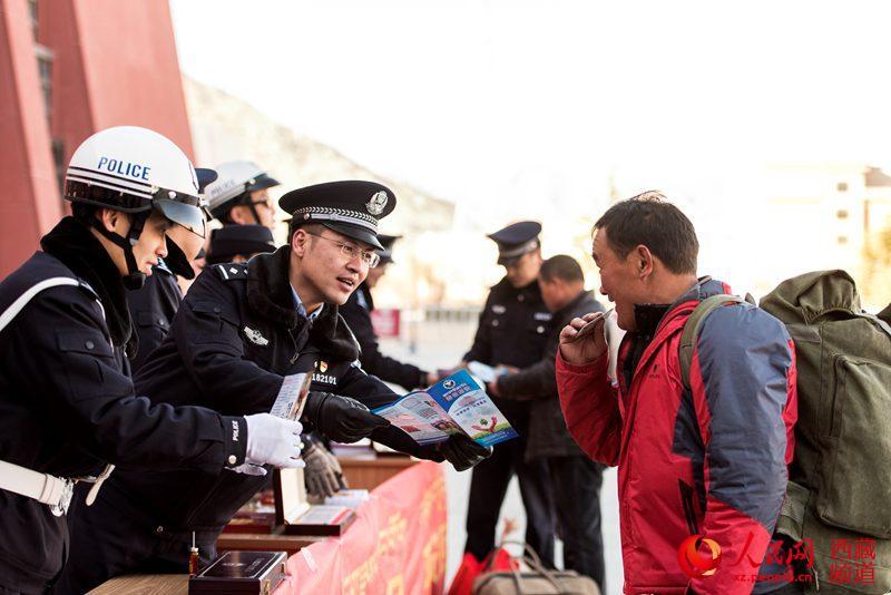春運(yùn)首日,拉薩鐵路公安處干警為旅客群眾做好事達(dá)800余件,為旅客解答問題3000余次,發(fā)放春運(yùn)各類宣傳資料3000余份,全力打造“平安、有序、溫馨”的春運(yùn)環(huán)境。圖為拉薩鐵路公安處民警為旅客講解禁毒常識。圖片來源:人民網(wǎng)