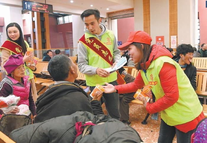 拉薩火車站團(tuán)委聯(lián)合中國移動西藏公司開展“黨團(tuán)志愿者愛心送溫暖 服務(wù)春運(yùn)返鄉(xiāng)農(nóng)民工”主題活動,一個個黨團(tuán)員志愿者的身影在候車室里忙碌著。圖為2月1日,中國移動西藏公司的志愿者正在拉薩火車站候車室給旅客發(fā)放奶茶、礦泉水。 圖片來源:西藏日報 李洲 攝