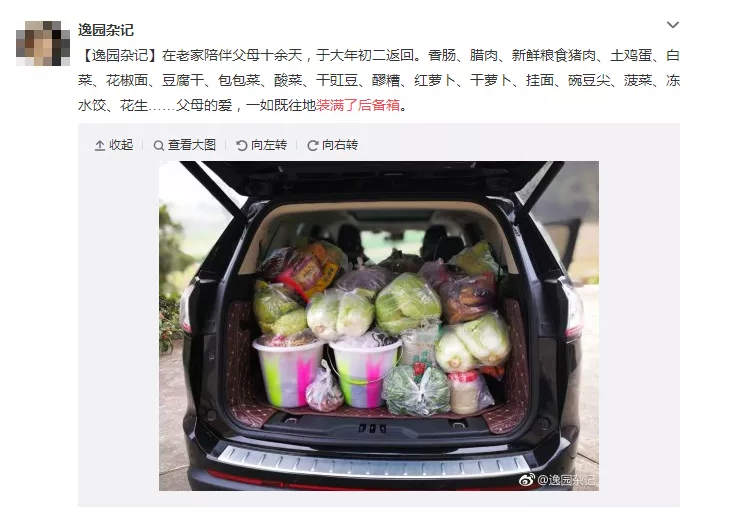 昨日,游子們從家這個(gè)港灣里,鳴笛啟航,奔向遠(yuǎn)方。除了對鄉(xiāng)愁的百轉(zhuǎn)千回,更有親情的濃郁化不開。這幾天,網(wǎng)友們都在微博里曬圖,“媽媽給裝的后備箱”的話題,一時(shí)成了熱點(diǎn)——“親手做的馬蹄糕”“最愛的家鄉(xiāng)小柚柑”“一大罐子土榨花生油”“秋天腌的糖蒜”……后備箱被爸媽塞得滿滿的,不愿帶還不高興。于是乎,調(diào)皮的網(wǎng)友留言:“明年我開個(gè)貨車回來過年!”