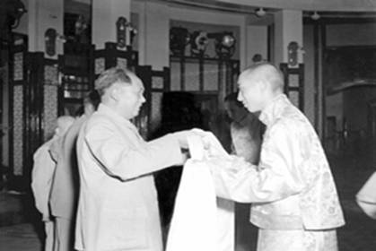 圖為十世班禪向毛澤東主席敬獻哈達。1954年,十世班禪受到毛主席等國家領(lǐng)導人的親切接見。他敬獻給毛主席的珍貴禮品表達了熱愛祖國大家庭、擁護黨的民族政策和人民領(lǐng)袖的心情。圖片來源:中國西藏之聲網(wǎng)