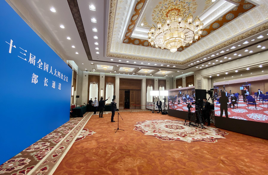 3月5日,十三屆全國(guó)人大四次會(huì)議開(kāi)幕會(huì)結(jié)束后,舉行首場(chǎng)“部長(zhǎng)通道”采訪(fǎng)活動(dòng),邀請(qǐng)部分列席會(huì)議的國(guó)務(wù)院有關(guān)部委負(fù)責(zé)人通過(guò)網(wǎng)絡(luò)視頻方式接受采訪(fǎng)。圖為“部長(zhǎng)通道”現(xiàn)場(chǎng)。新華網(wǎng) 王翰林 攝
