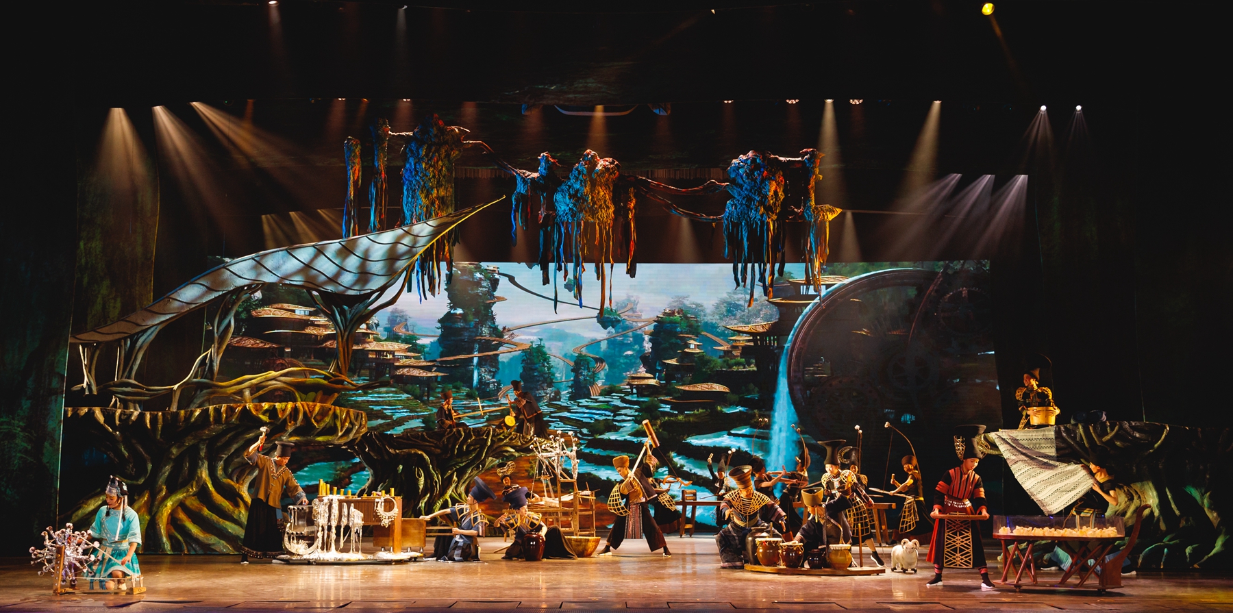 清晨,張家界大山中的古老山寨在雞鳴犬吠聲中蘇醒,山民們在晨曦里忙碌起各自的營生。于是缸、罐、盆、碗變成了樂器,彈棉花、篩米、紡紗、鋸木合奏成了優(yōu)美的旋律,苗族水腔、土家族打溜子等非物質文化遺產(chǎn)依次呈現(xiàn)……